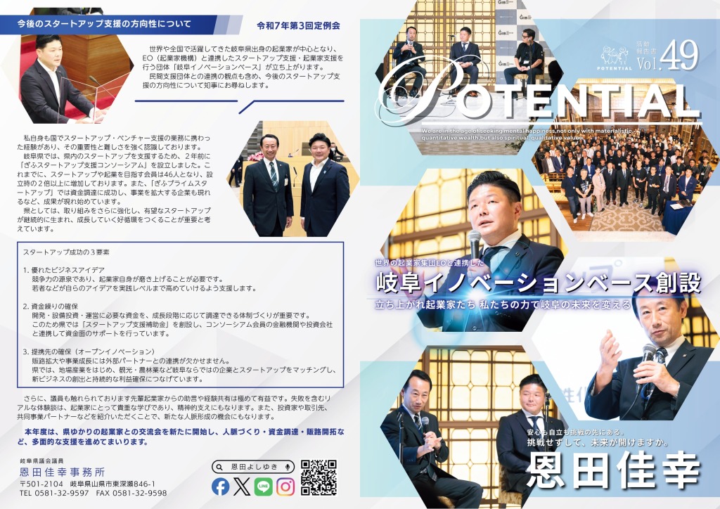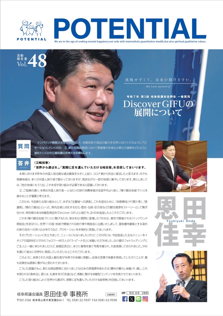第4回岐阜県議会議員恩田よしゆき県政報告会を 開催させて頂きました所、本当に多くの皆様に ご臨席を賜り、心から感謝申し上げます。 今回の県政報告会では初めての試みとして 『これからの教育について』専門家を交えて、 討論会を開催させて頂きました。 これからも時代が抱える各種課題について、 市民の皆様と共に考えながら、 山県市の実情に沿った解決方法とあるべき姿を 導き出していきたいと考えております。 岐阜県議会議員 恩田佳幸